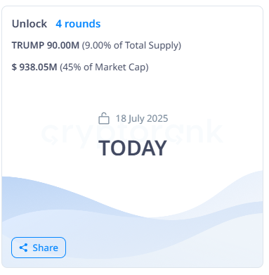 OFFICIAL TRUMP 最近迎来了六个月来的首次大规模代币解锁,市场上涌入了新的供应。今天解锁的 9,000 万 TRUMP 币,价值 9.38 亿美元,虽然比 1 月份的解锁规模小得多,但仍显著增加了流动性。