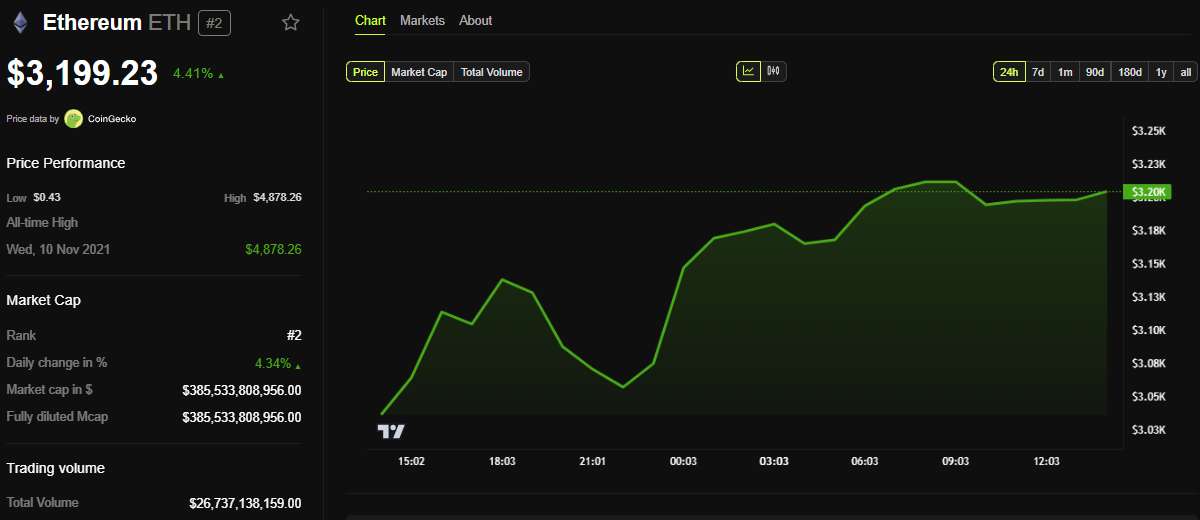 BeInCrypto 數據顯示,ETH 在此消息中交易價格為 3,199 美元,自週二開盤以來上漲了近 5%。分析師也觀察到大戶的興趣增加,這可能對以太坊的價格有利。