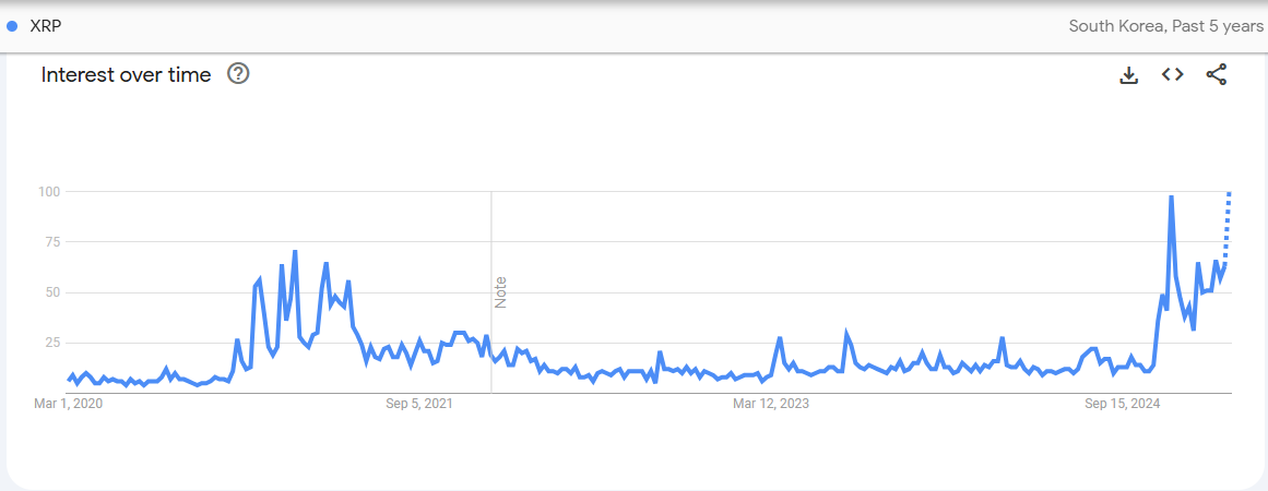 然而,Google 趨勢數據證實了這一前景。它顯示南韓對「XRP」的搜索興趣達到了過去五年的最高水平。