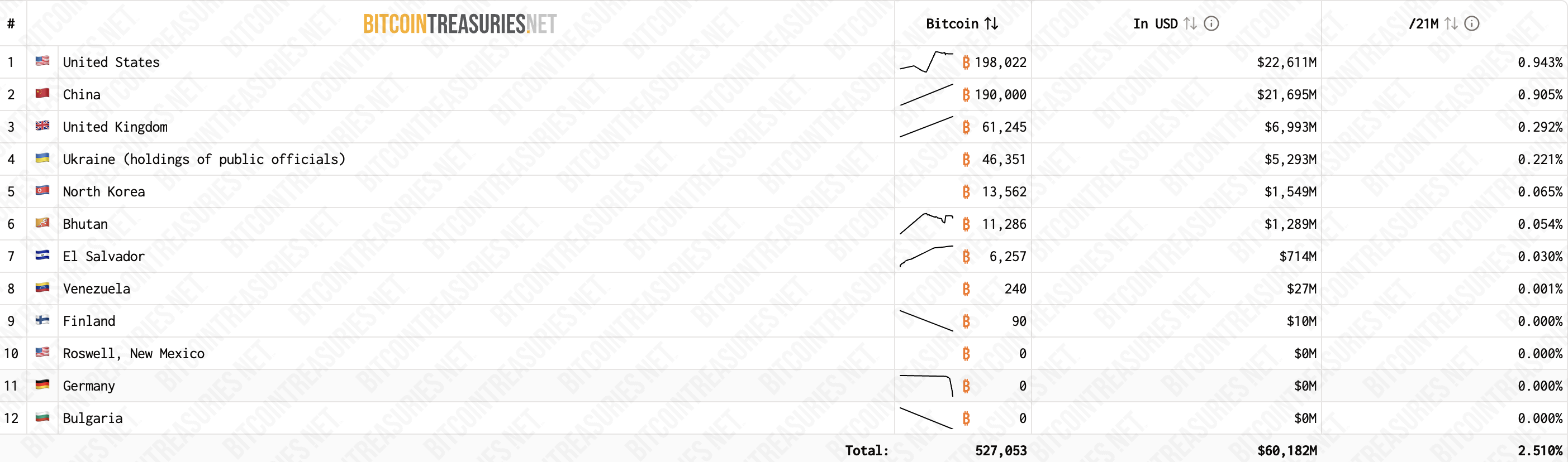 此外,根据 Bitcoin Treasuries 的最新数据,美国政府目前持有约 198,022 枚比特币,占总供应量的不到 1%。