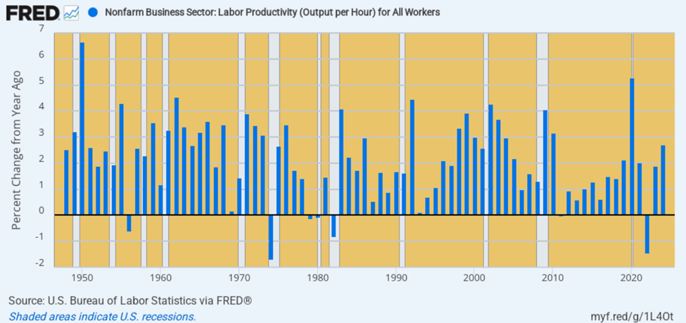 这些数据点显示了第二季度(Q2)的工资增长情况。在第一季度,美国生产率下降了 1.5%,但现在经济学家预计将增长 1.9%。