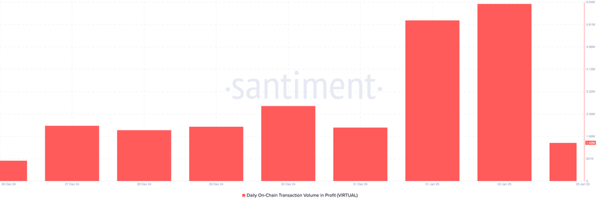 根據 BeInCrypto 的調查,這一雙位數的下降可能與持有者顯著的獲利了結有關。根據 Santiment 的數據,1 月 1 日的鏈上利潤量為 595 萬。這一指標衡量在特定期間內的實現利潤水平。但在 1 月 2 日,即同一時間窗口,VIRTUAL 創下新高,利潤量上升至 656 萬。