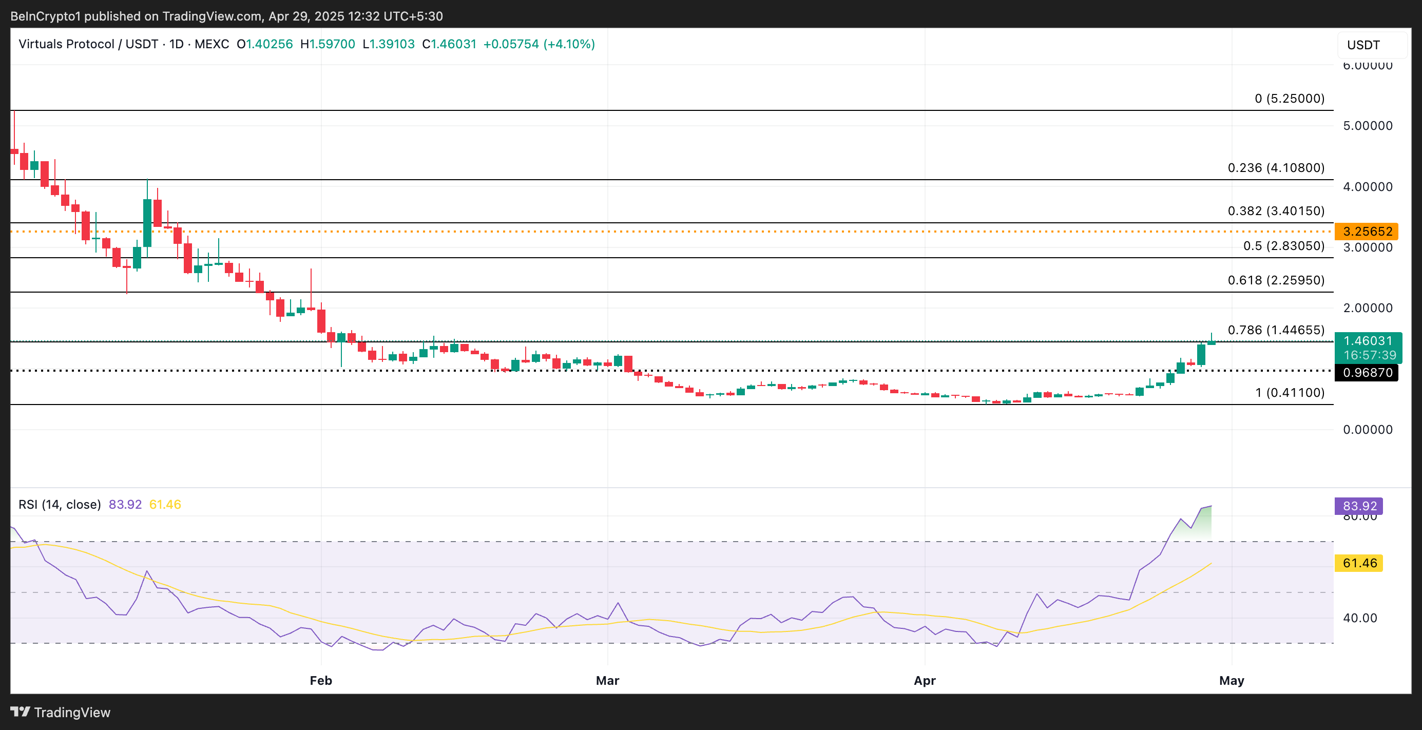 僅今天,VIRTUAL 上漲了 18%,成為加密貨幣市場的最大贏家。截至撰寫本文時,交易價格達到兩個月高點 1.46 美元,技術指標顯示價格可能進一步上漲。