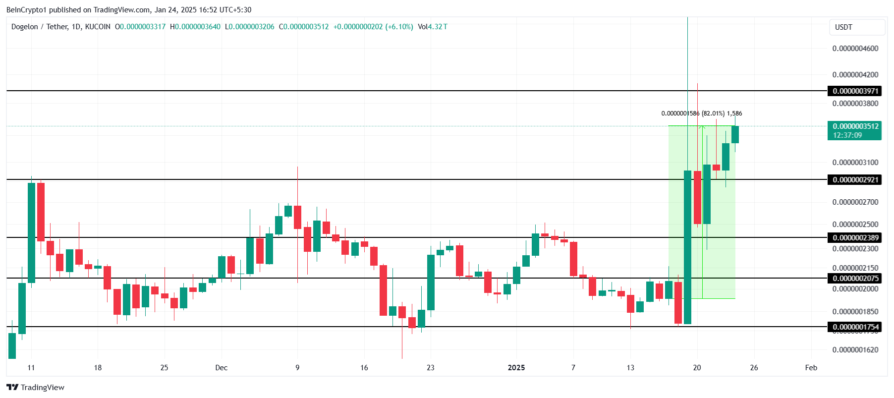 ELON 價格上漲 82%,達到 0.0000003512 美元,成功守住 0.0000002921 美元作為支撐水平。這一上升動能使該幣目標達到 0.0000004000 美元,反映出對其進一步增長潛力的信心增強。