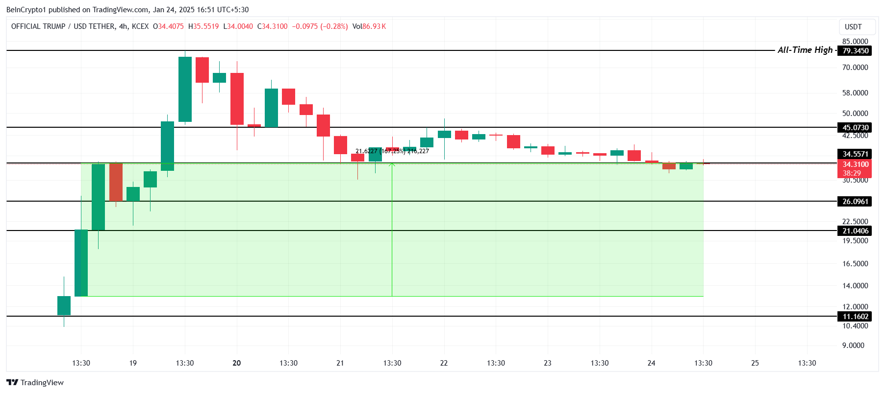 目前交易價格為 34.31 美元,TRUMP 目標是將 45.07 美元作為支撐以維持上升趨勢。如果未能守住此水平,價格可能下跌至 26.09 美元或更低,無效看漲前景。