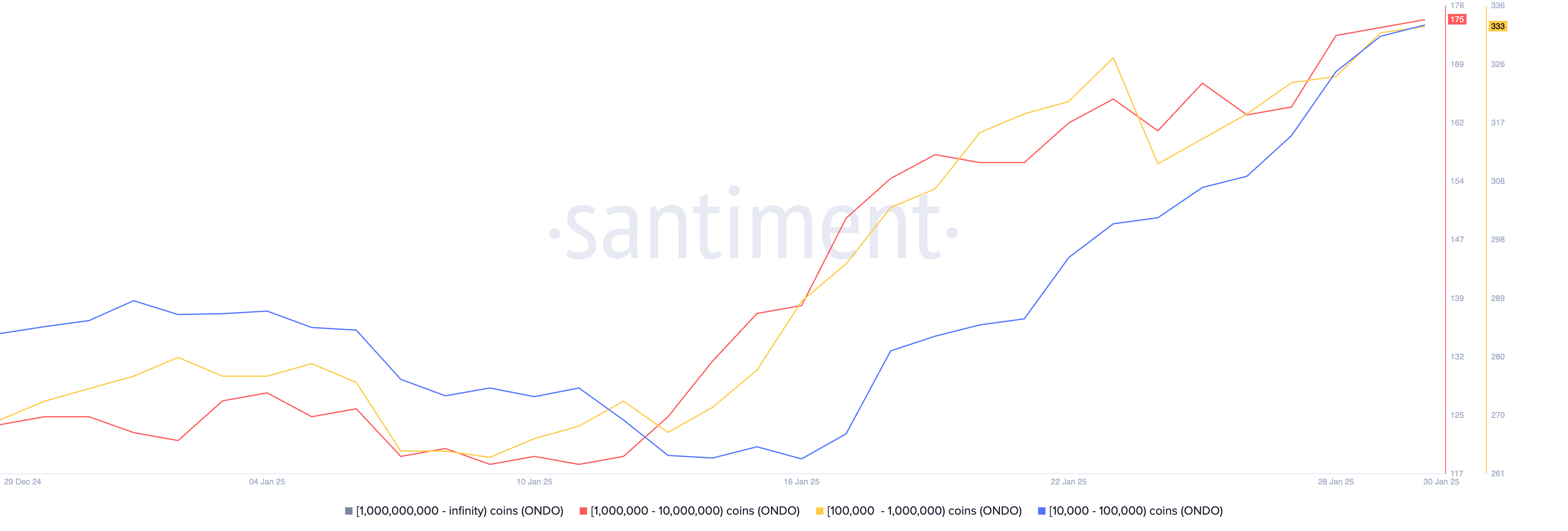過去兩週,巨鯨積極購買 ONDO。持有 10,000 至 100,000 ONDO 的地址從 1,727 增加到 2,221,而持有 100,000 至 1,000,000 的地址從 289 增加到 332。持有 1,000,000 至 10,000,000 ONDO 的更大巨鯨從 139 增加到 175。
