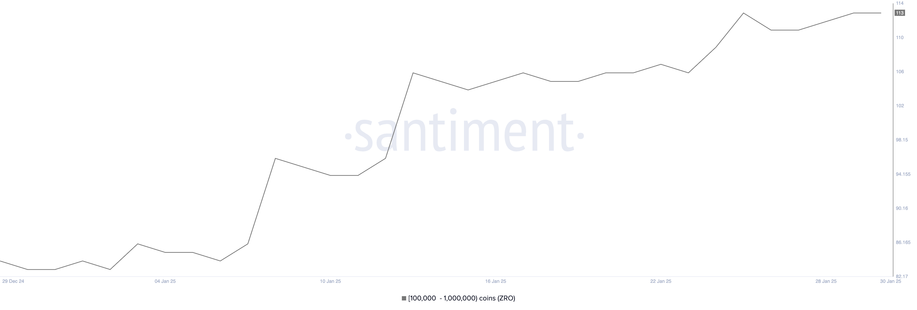 巨鯨在整個 1 月穩步購買 ZRO。從 2024 年 12 月 29 日到 2025 年 1 月 30 日,持有 100,000 到 1,000,000 ZRO 的地址數量從 84 增加到 113。