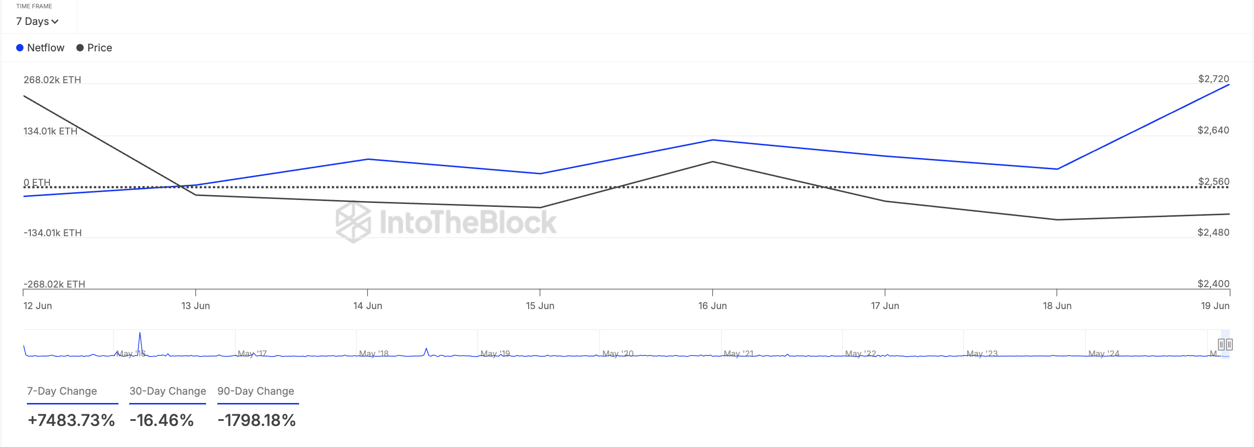 尽管本周价格表现平淡,顶级山寨币 $ETH仍是加密鲸鱼本周购买的资产之一,因为市场正在应对剧烈的波动。根据 IntoTheBlock 的数据,其大持有者净流量在过去七天内增长了超过 7000%。