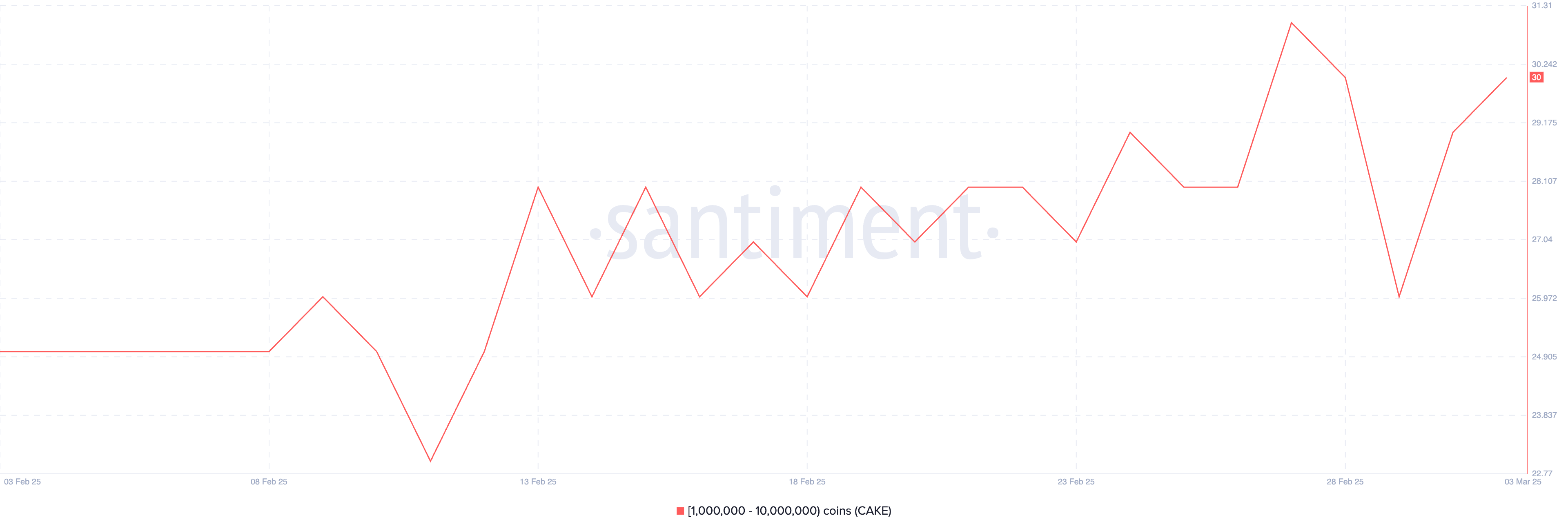 隨著這一增長,加密巨鯨在過去幾天購買了 CAKE,增加了累積。持有 1M–10M CAKE 的錢包數量從 3 月 1 日的 26 回升至現在的 30。