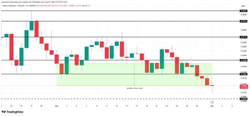 从历史数据来看,9 月对 HBAR 来说一直是表现不佳的月份。平均而言,该代币在此期间下跌 10%,中位数跌幅为 5%。基于这一模式,进一步下跌的可能性依然较高,与当前技术信号一致,这些信号显示支撑位正在减弱。
