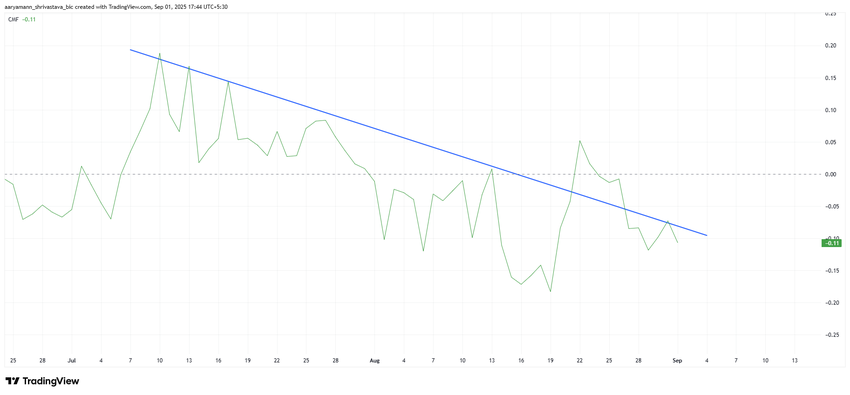 技术指标显示未来面临挑战。Chaikin 资金流量指标(CMF)显示过去两个月 $HBAR 的强劲资金流出。这种持续的卖压是该代币下跌的主要原因之一,限制了可能因网络增长或更广泛采用而出现的任何动能。
