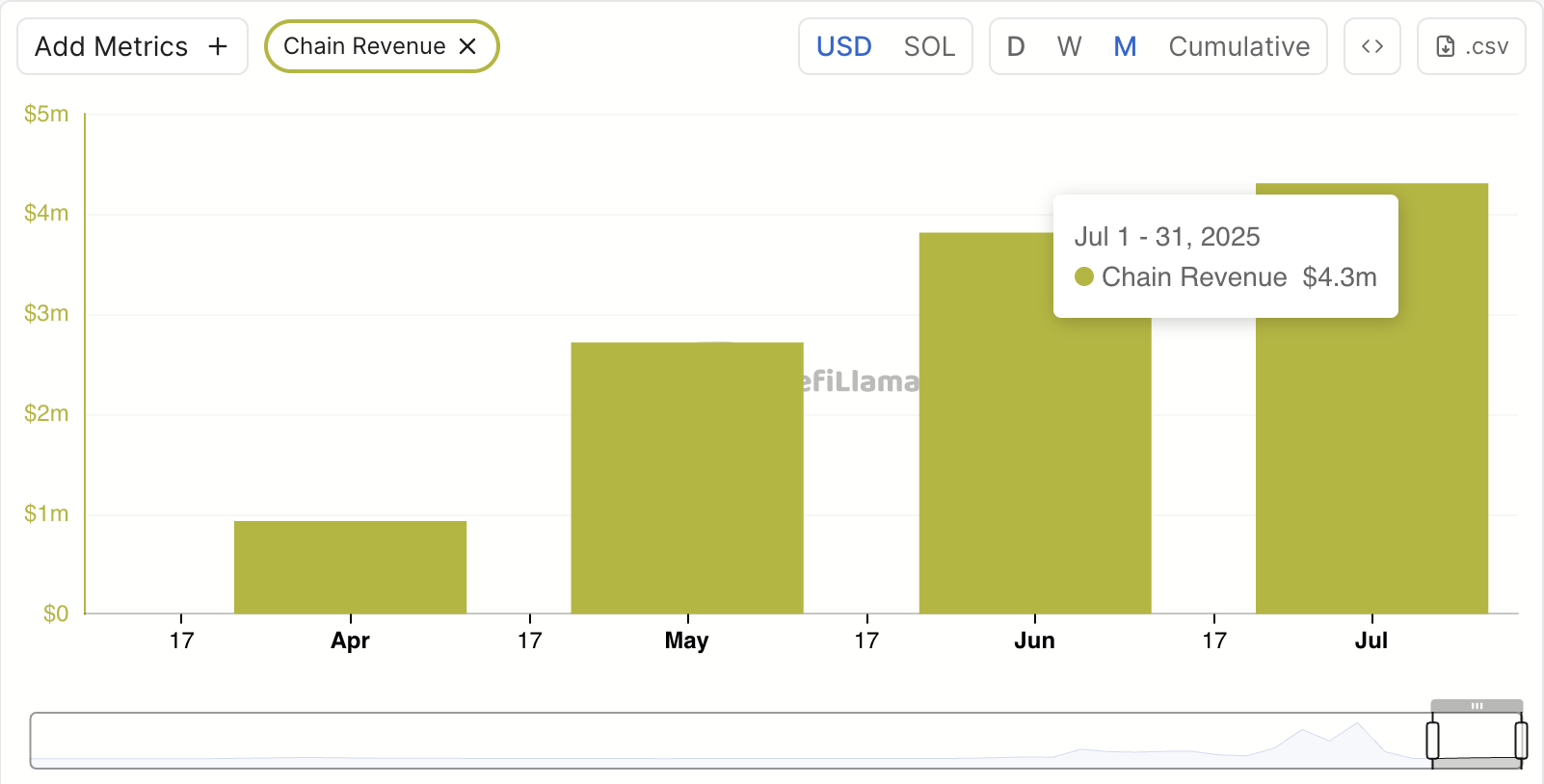 这种活动的激增转化为更高的网络收入。根据 DefiLlama 的数据,自 7 月初以来,Solana 已产生 430 万美元的收入,比 6 月的 381 万美元增长了 13%。