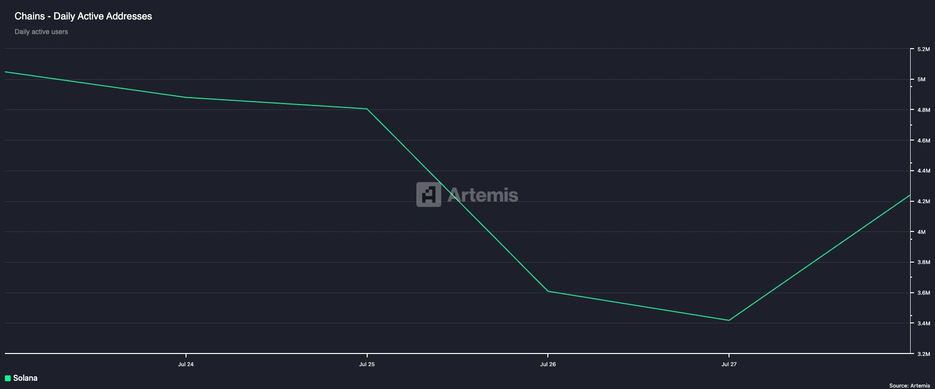 例如,Solana 的日活跃地址数量在过去 7 天内大幅下降。根据 Artemis 的数据,这一数字在此期间下降了 16%。