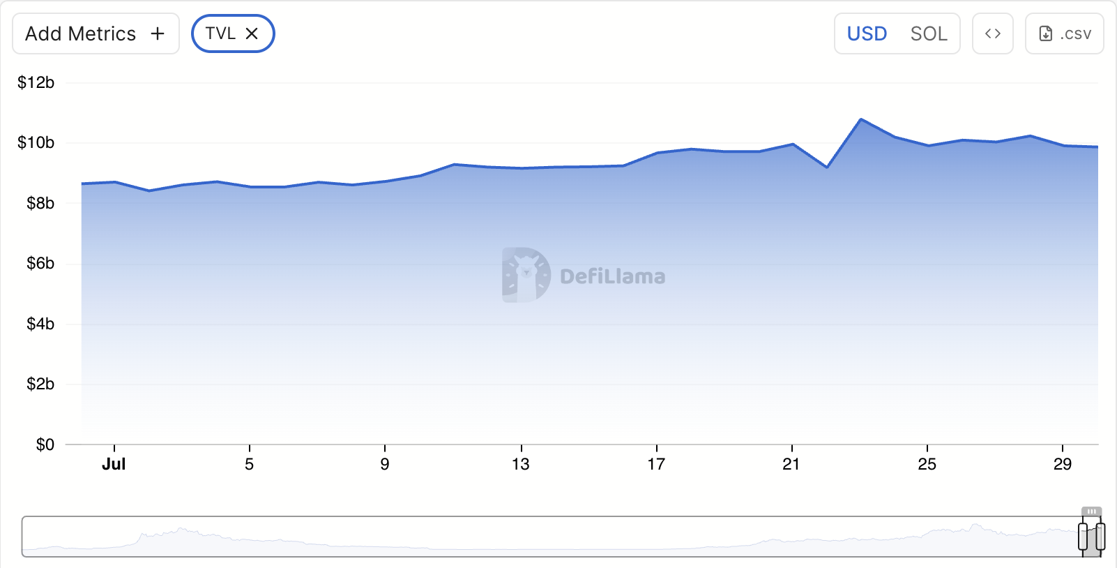 截至发稿时,Solana 的 TVL 为 98.5 亿美元,较上月增长了 14%。