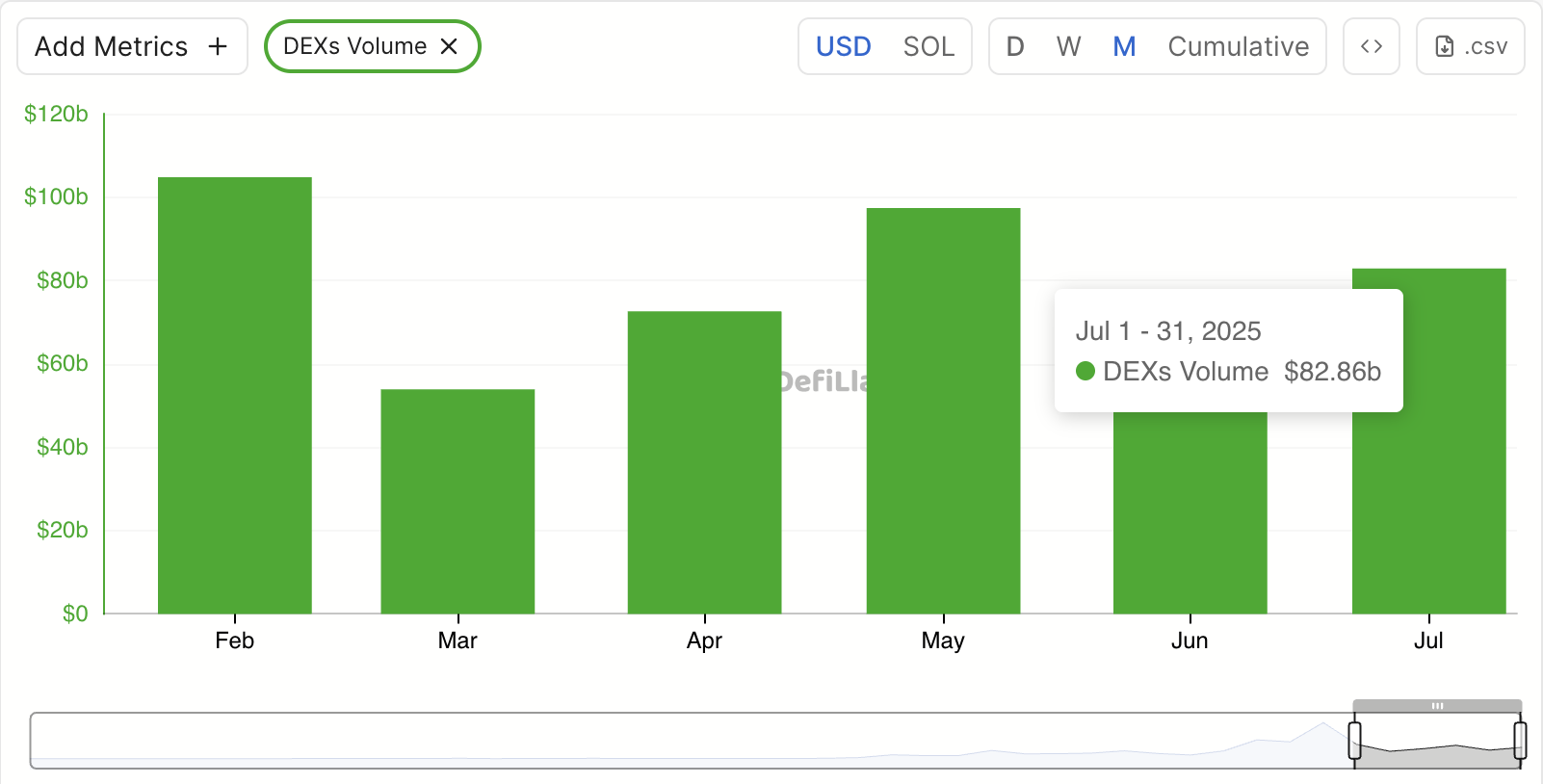 这一价格上涨引发了 Solana 生态系统内链上活动的激增,推动其去中心化金融(DeFi)总锁仓价值(TVL)、去中心化交易所(DEX)交易量和整体链上收入的增长。然而,疲态开始显现。SOL 已回落至 190 美元以下,面临的抛售压力表明投资者可能在锁定 7 月的收益后开始撤出。
