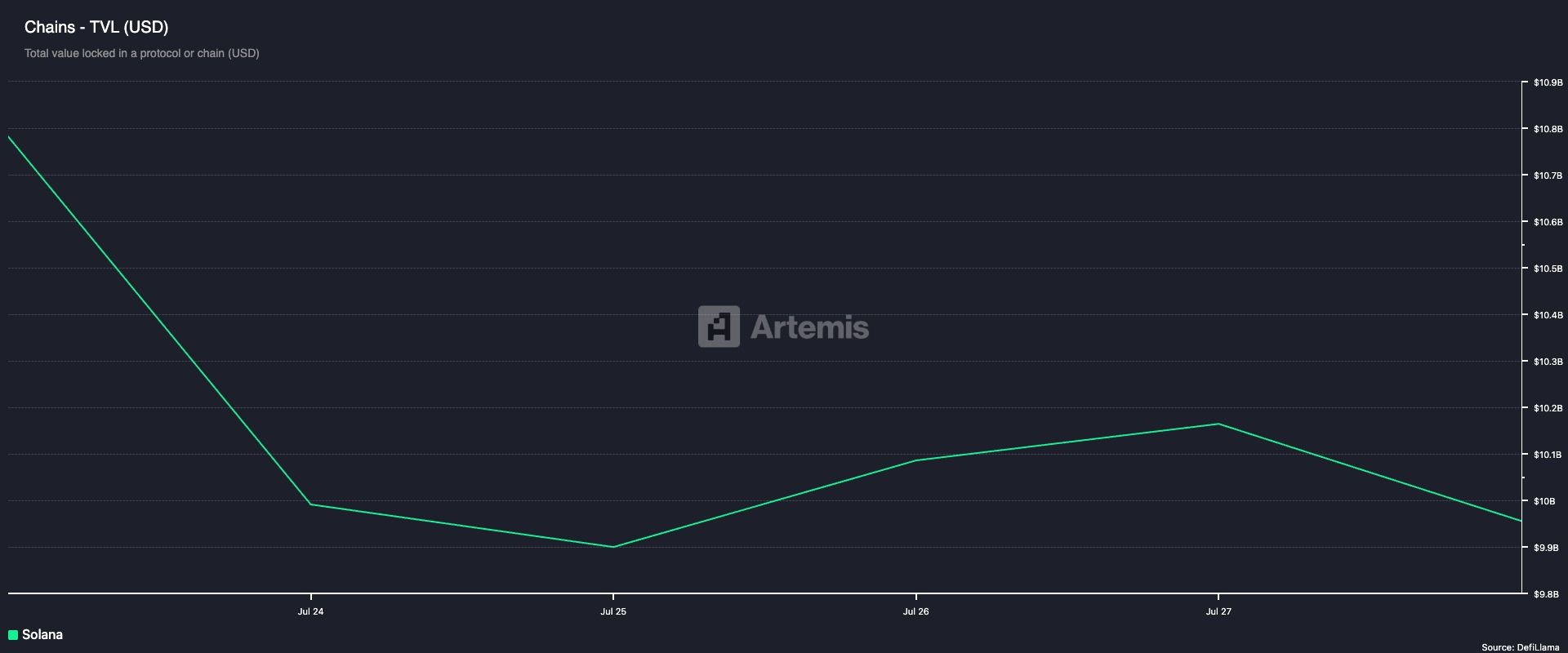 随着网络活动的下降,Solana 的 DeFi 总锁仓量(TVL)也开始回落。过去一周,TVL 下降了 8%。