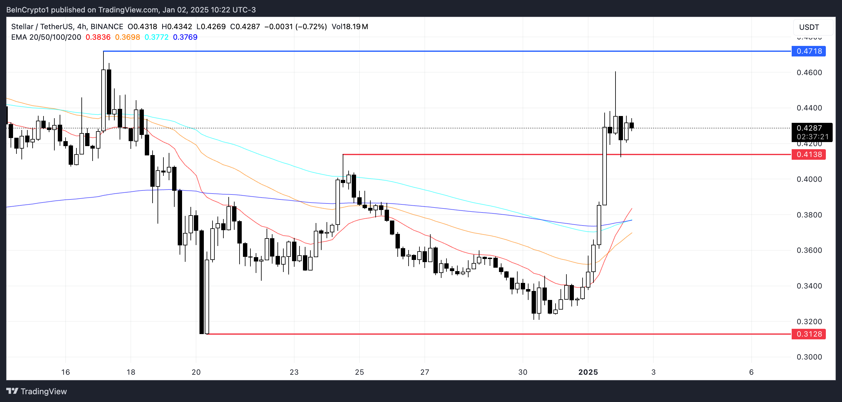 Stellar 的 EMA 線最近形成了金叉,這是一個看漲指標,當短期 EMA 越過長期 EMA 時出現。