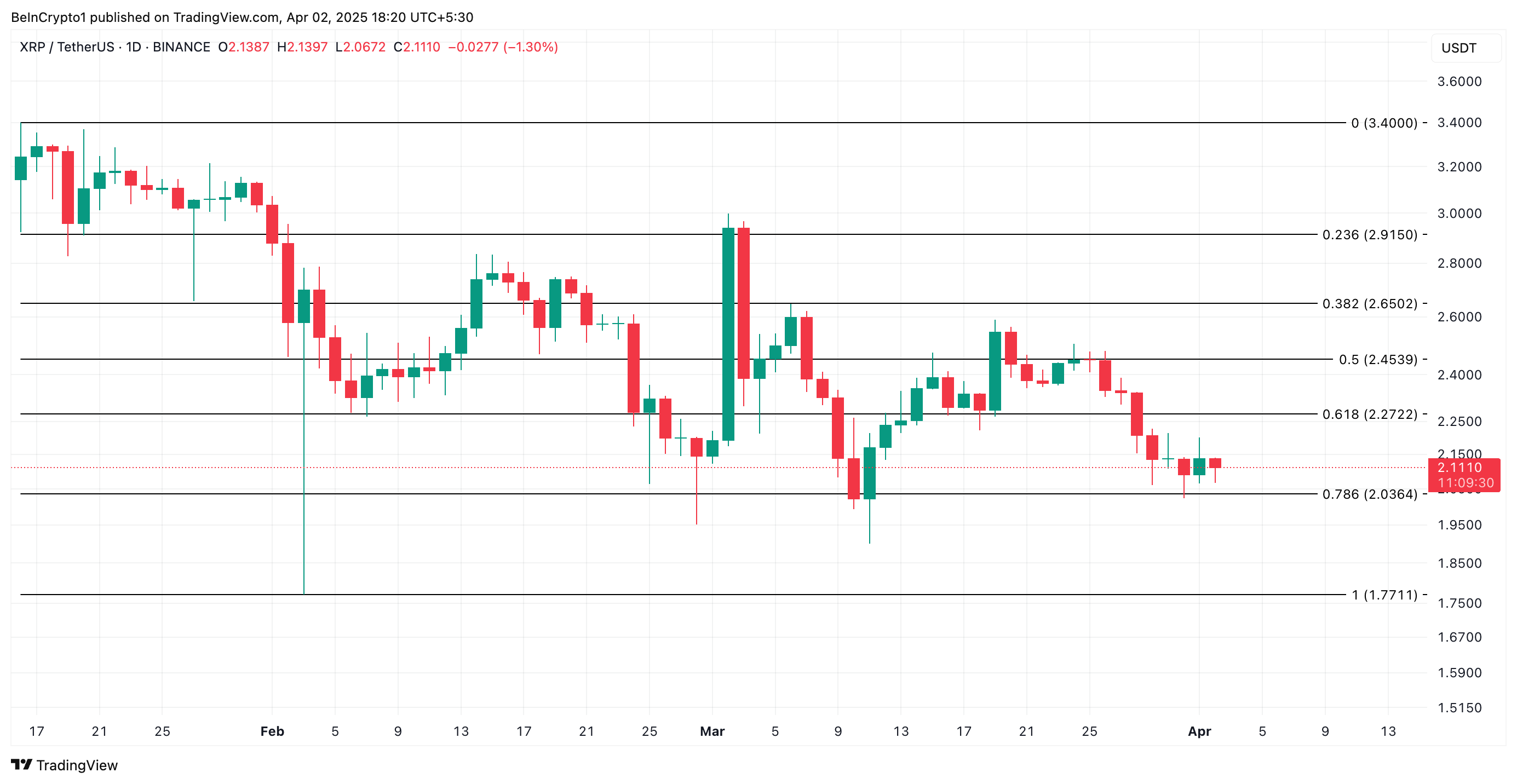 截至發稿時,XRP 的交易價格為 2.11 美元,高於 2.03 美元的關鍵支撐位。如果賣壓加大且 XRP 跌破此支撐位,其下行趨勢將加速,價格可能跌破 2 美元至 1.77 美元。