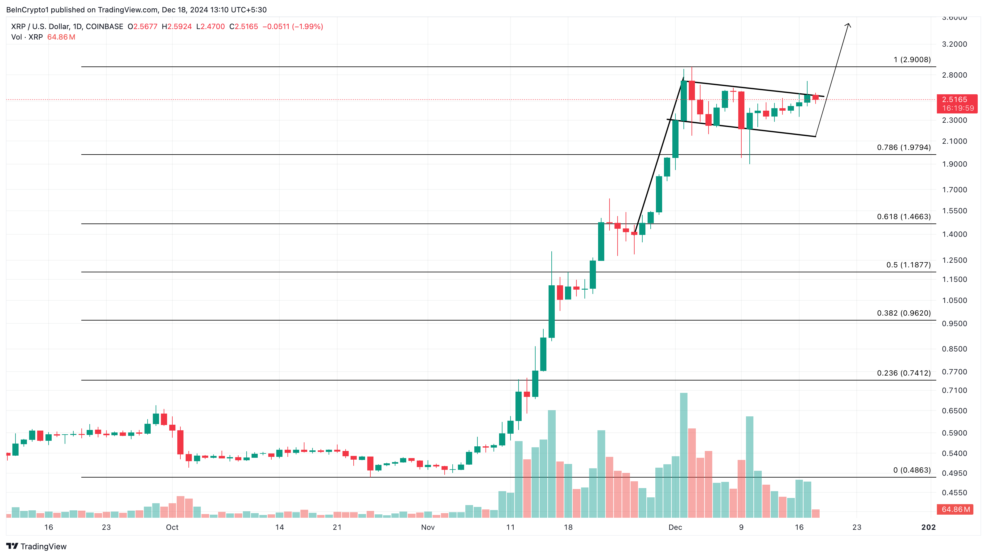 BeInCrypto 對 XRP/USD 日線圖 的評估顯示,山寨幣已經形成了牛市旗幟。牛市旗形是一種看漲形態,其特徵是兩次向上的反彈,中間有一個短暫的盤整階段。