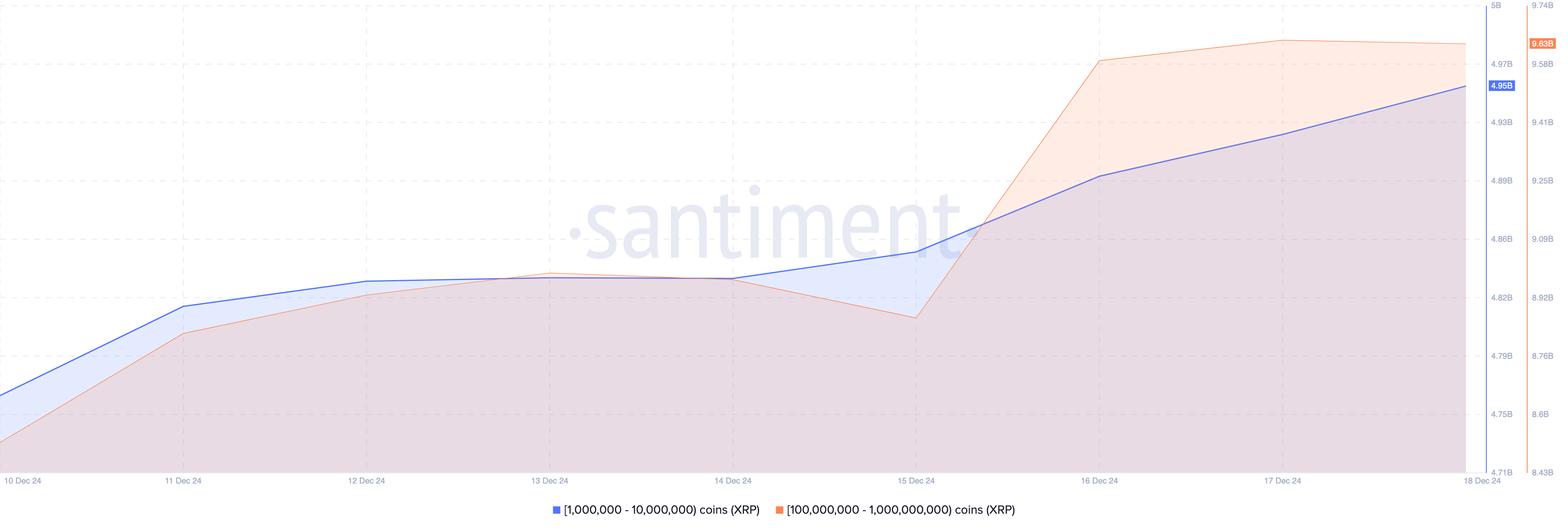 根據 Santiment 的數據,XRP 位址持有 100 萬至 1000 萬個代幣,其總餘額已從 12 月 15 日的 48.5 億增加到今天的 49.5 億個,這反映了過去三天額外購買了 1 億個 XRP。
