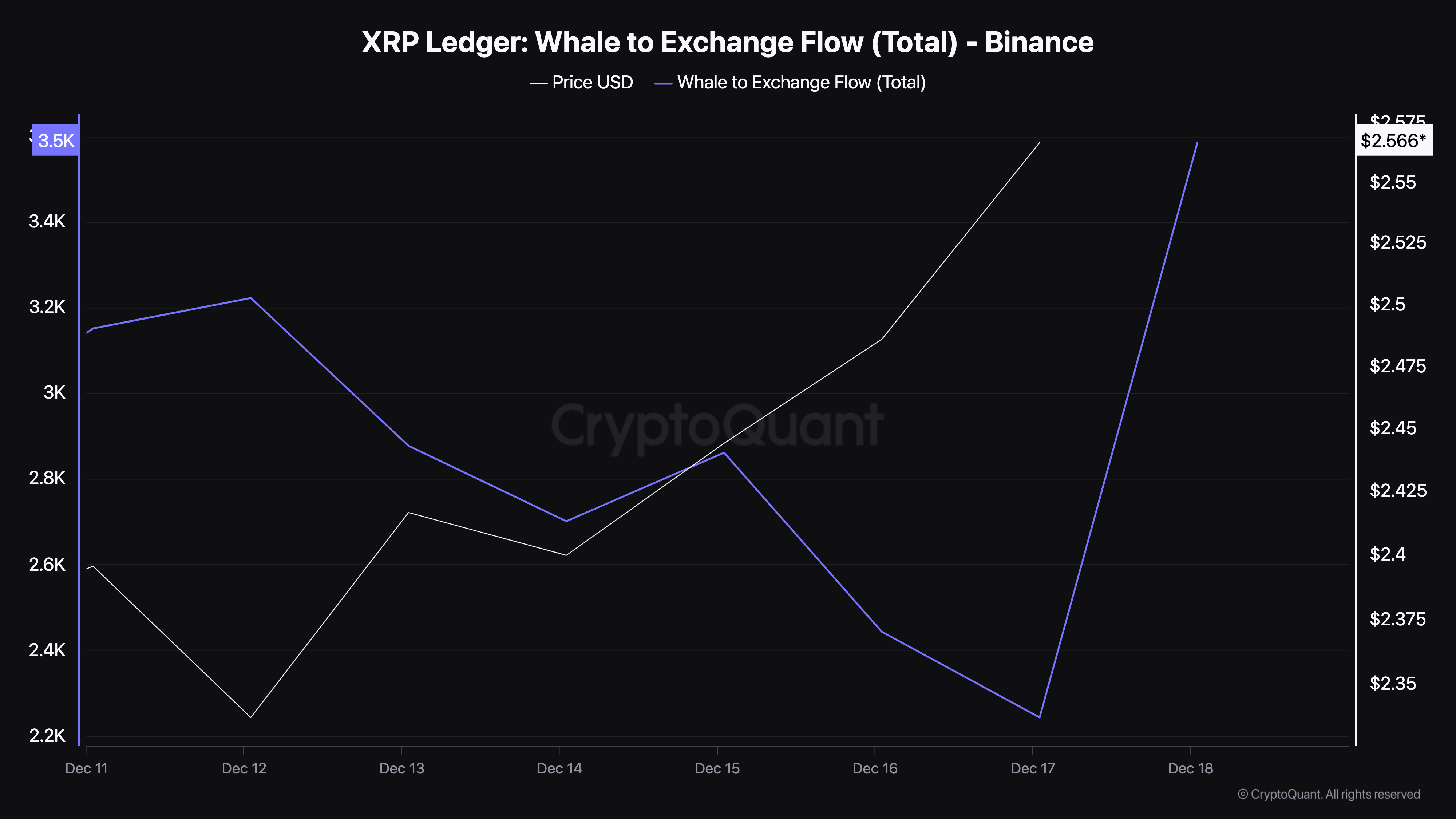 然而,來自 CryptoQuant 的鏈上數據表明, 預期的突破可能不會 那麼快發生。這基本上是因為 XRP 鯨魚交易流量。