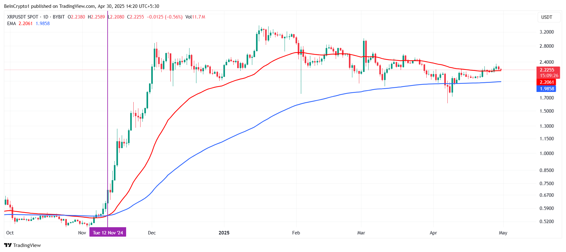 XRP 的宏觀動能顯示出積極的跡象,因為該加密貨幣正遠離潛在的死亡交叉,這可能預示著價格的顯著下跌。50 日指數移動平均線(EMA)目前呈上升趨勢,為XRP 提供支撐,使其遠離看跌區域。K 線圖也位於 50 日 EMA 之上,這表明該山寨幣正在增強,可能會繼續上升。