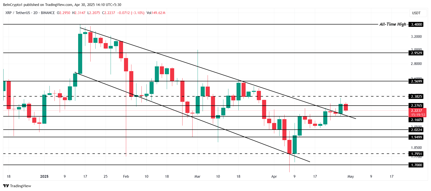 XRP 目前的交易價格為 2.22 美元,突破了近 5 個月的下降楔形。如果這次突破持續,將標誌著自 1 月份開始的年度最大跌勢的結束。下一個關鍵阻力位在 2.38 美元,若成功突破此水平,可能預示著 XRP 將進一步上漲。