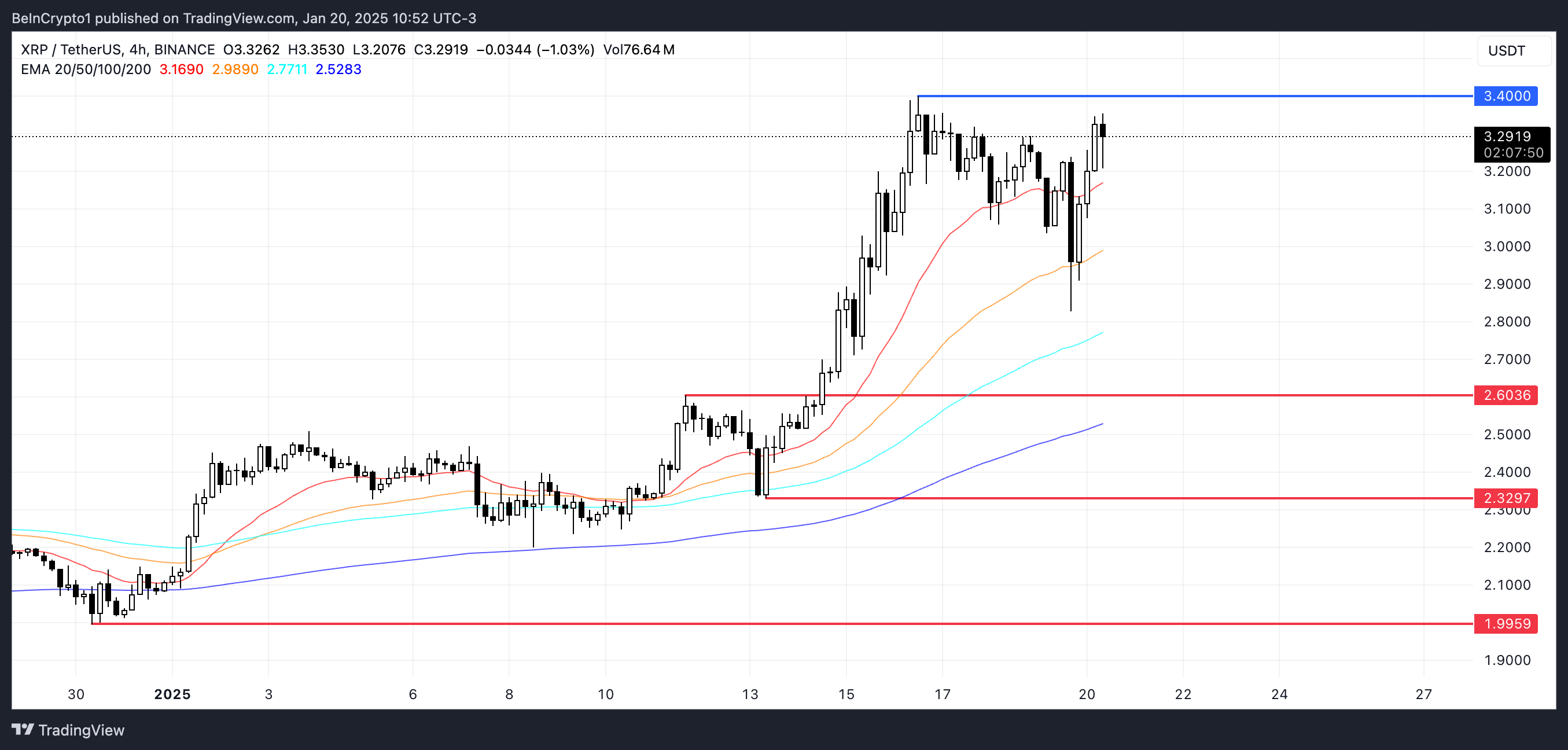 XRP 的 EMA 線目前顯示看漲格局,短期線位於長期線之上,顯示上升動能。如果這一正趨勢進一步增強,XRP 價格可能上升至測試超過 3.40 美元的水平,潛在創下歷史新高。