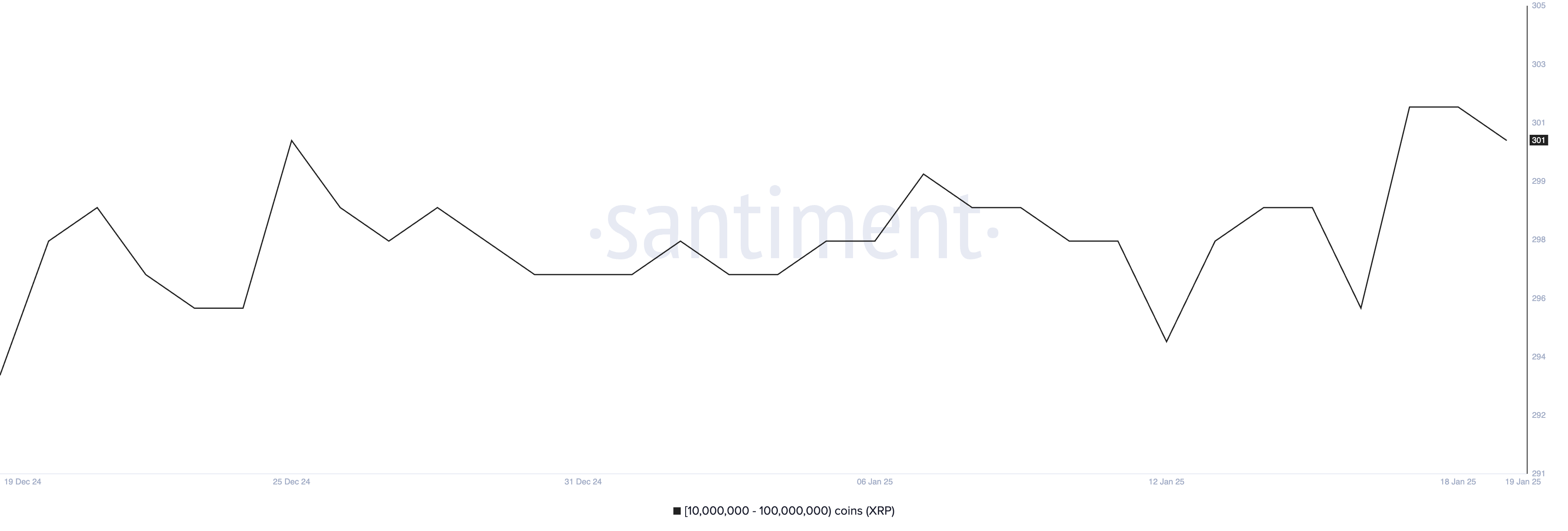 持有 1000 萬至 1 億 XRP 的巨鯨數量在 1 月 17 日達到 302,創下歷史高位之一。雖然這一數字略微下降至 301,但仍保持在高位,顯示大型持有者的持續信心。