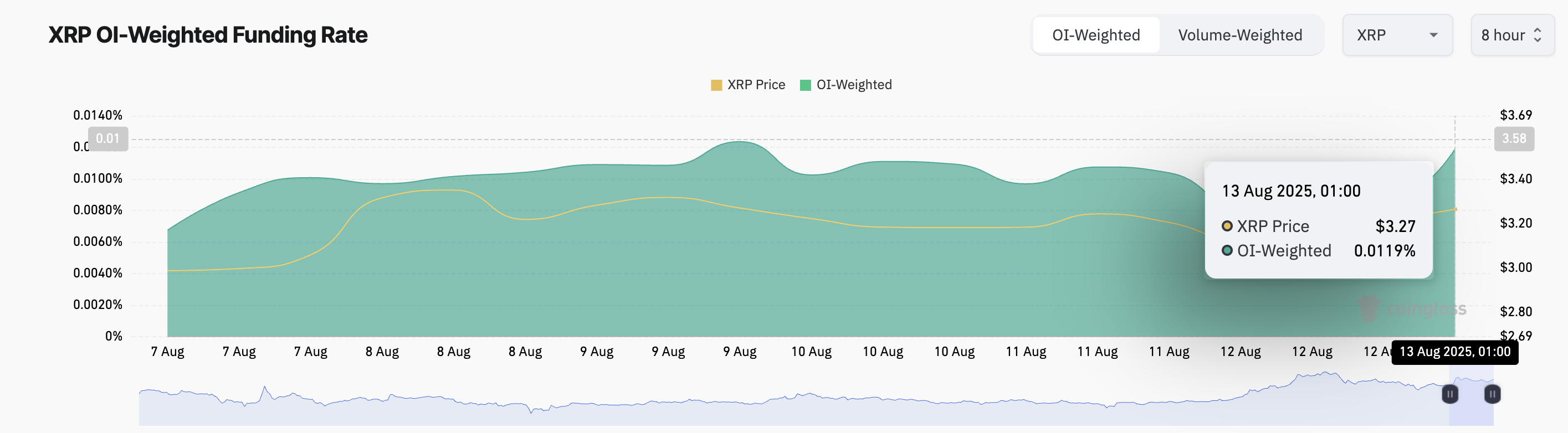 根据 Glassnode 的数据,截至 8 月 12 日,未平仓合约量达到年内高点 287,200 $XRP,显示出大型市场参与者的参与度正在增加。