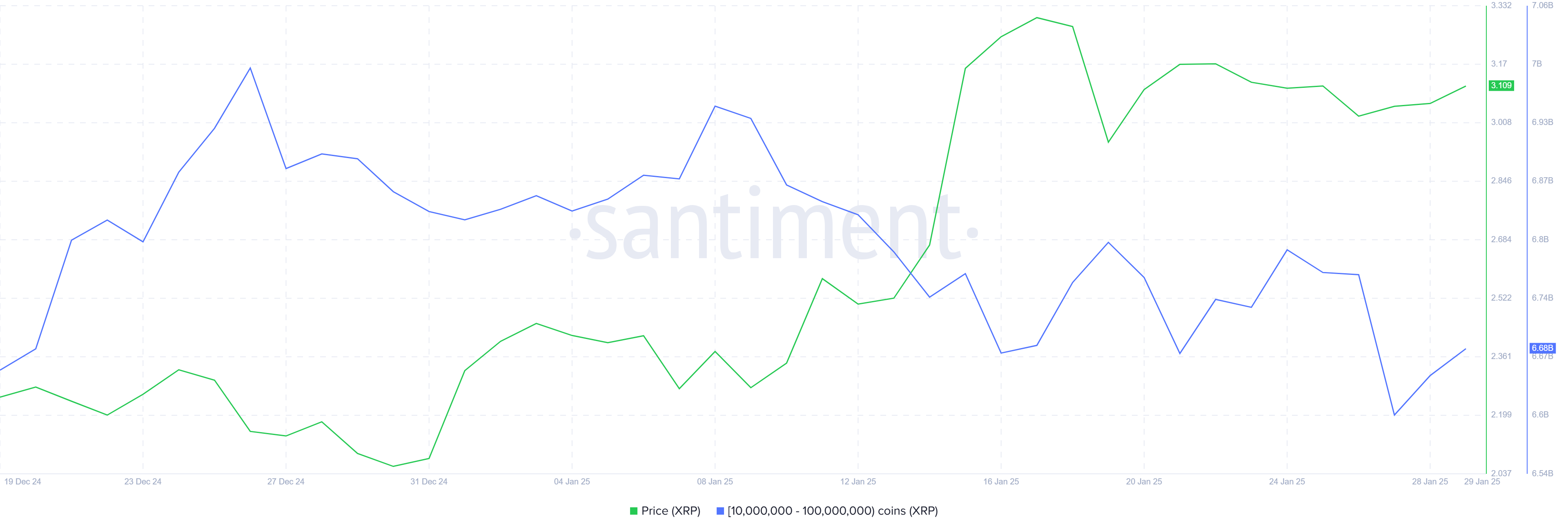 在撰寫本文時,XRP 的交易價格為 3.10 美元,保持在 2.95 美元的支撐位之上。這一門檻在過去 10 天內已被測試兩次,顯示其在防止進一步下跌中的重要性。成功守住此水平可能為潛在的反彈奠定基礎。