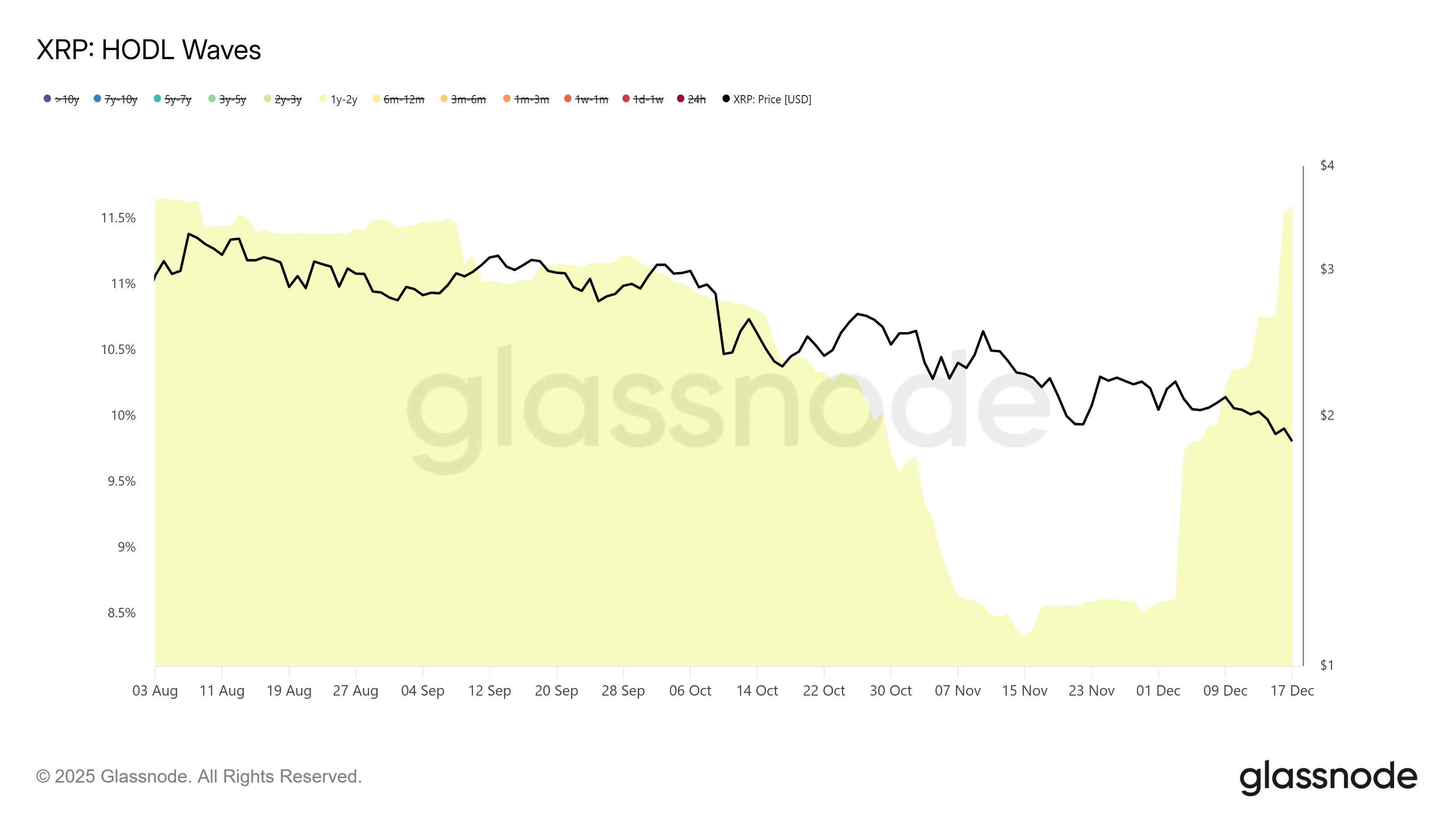 HODL Waves 数据显示,长期持有 $XRP 投资者的信念正在增强。今年 6 月以来,持币 1—2 年的钱包数量占比提升 3%。目前,这部分投资者已掌控约 11% 的 $XRP 流通量。