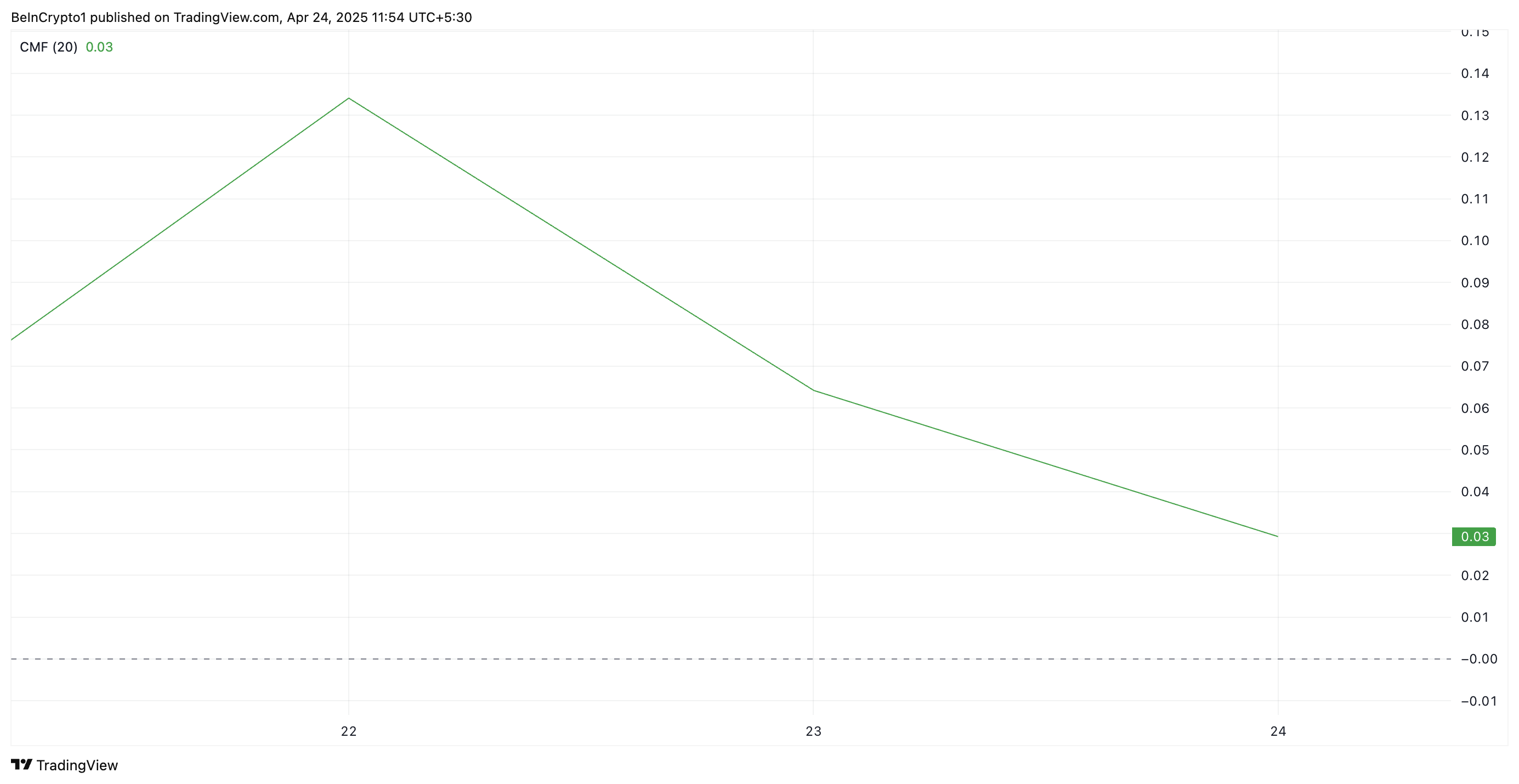XRP 的 蔡金資金流量指標(CMF)——一個衡量資金流入和流出資產的量化指標——即使在代幣價格持續上漲的情況下,仍呈下降趨勢。目前,這一動能指標顯示為 0.03,並趨向中心線。