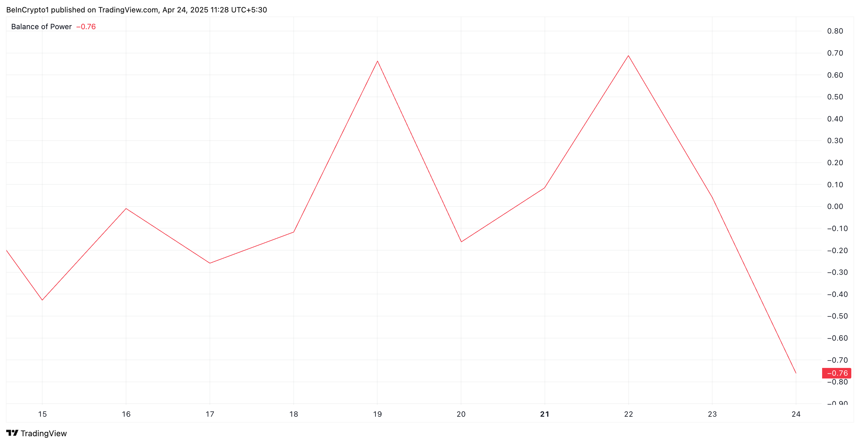此外,該山寨幣的負能量潮指標(BoP)也支持這一看跌觀點。截至撰寫本文時,該指標為 -0.76,顯示出對 XRP 的需求正在減弱。