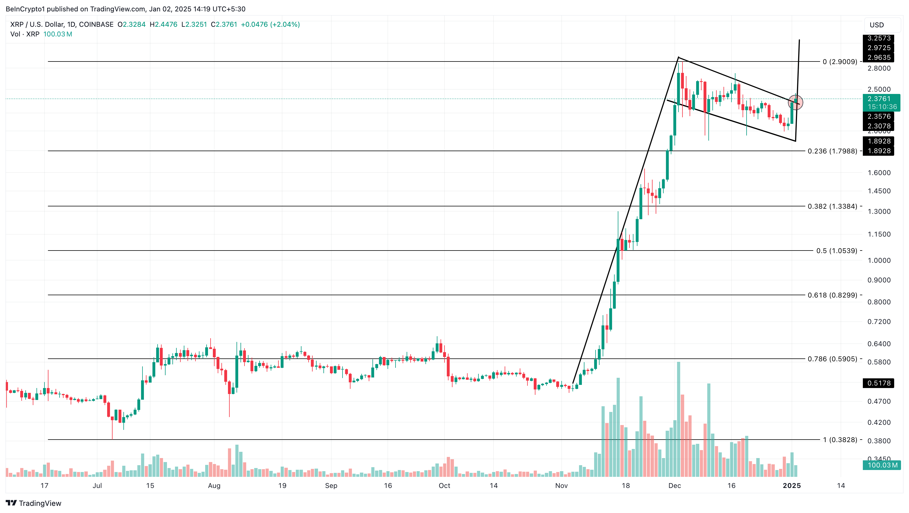 隨著 XRP 在年底收於 2 美元以上,日線圖顯示該山寨幣已形成牛旗。牛旗形態類似於旗桿上的旗幟,在分析加密貨幣時被視為重要信號。