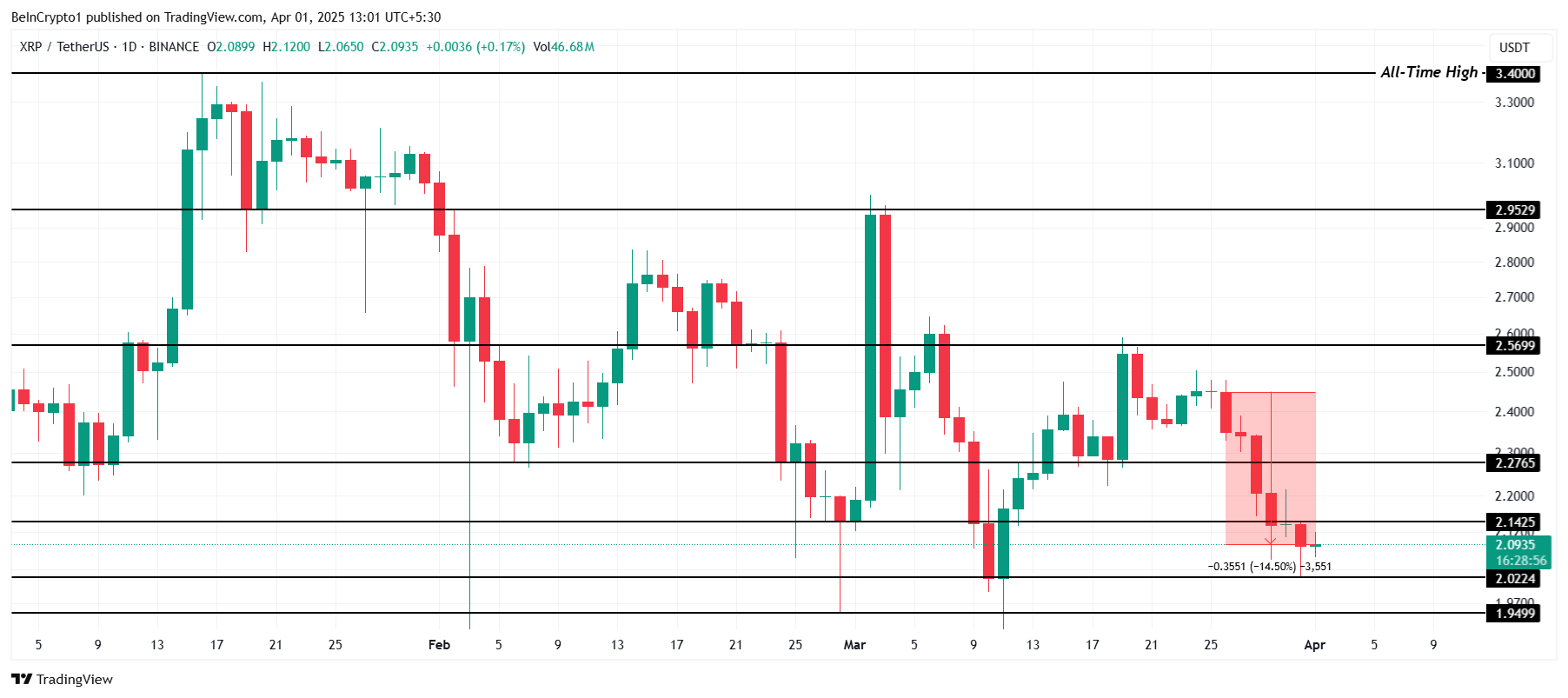 XRP 近日持續下跌,價格大幅下滑,接近 2 美元大關。這導致該加密貨幣的損失擴大,賣壓顯著增加。