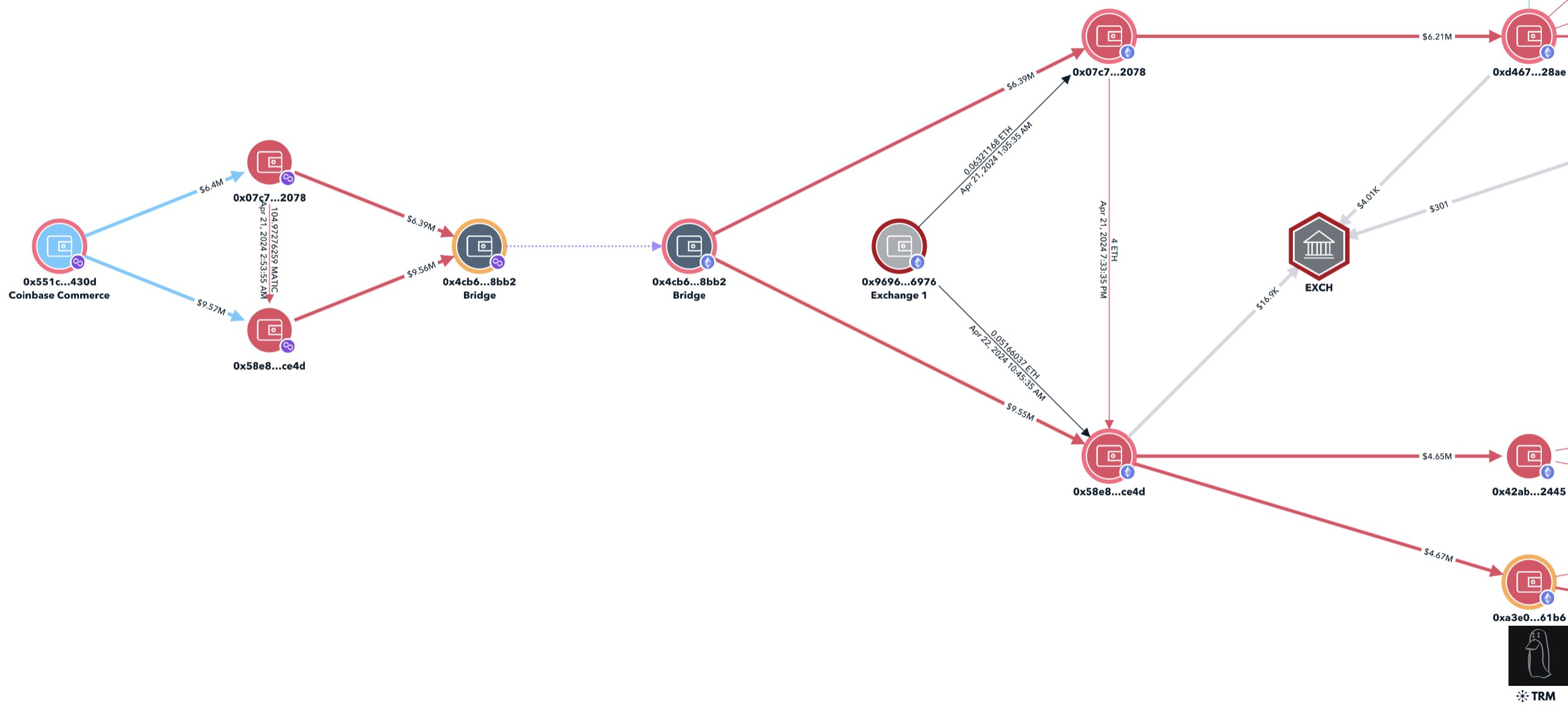 罪犯迅速將價值超過 1590 萬美元的等值 USDC 橋接到 Polygon,然後轉移到以太坊。之後,這些資金被分成三個錢包,其中大部分保持不動。