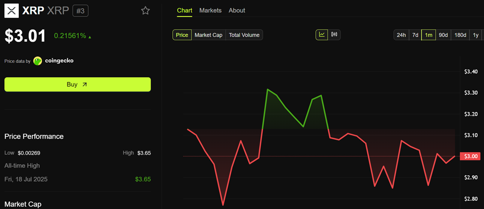 这些评论出现在 $XRP 的市场表现承压并陷入横盘整理之际。截至本文发布时,该代币的交易价格为 3.01 美元,日内上涨 0.21%。