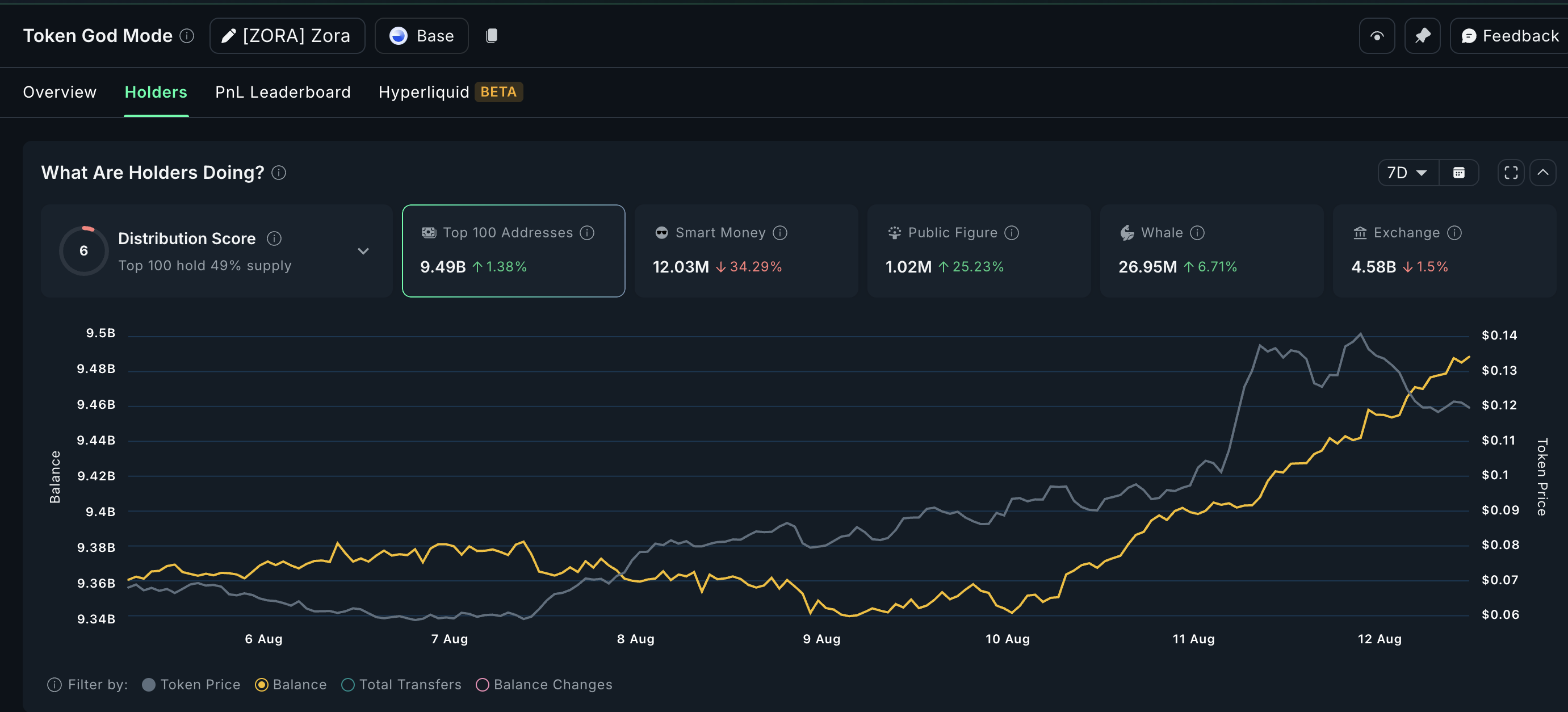 根据 Nansen 的链上数据显示,在 ZORA 价格上涨 80% 的同一七天内,交易所鲸鱼和高知名度钱包继续增持。