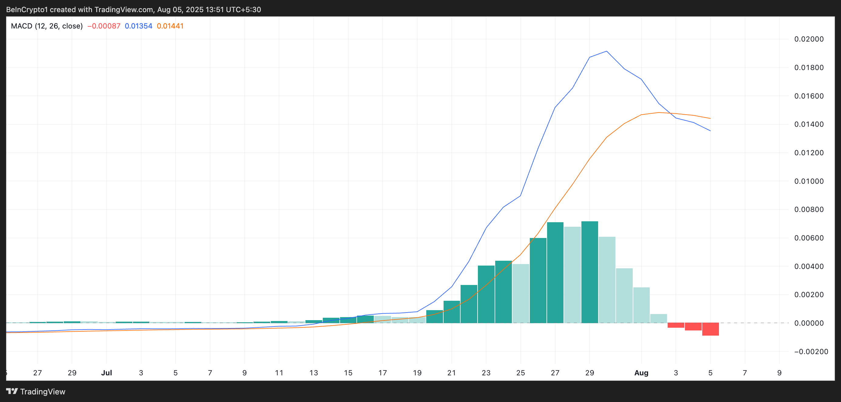 从 ZORA/USD 日线图的数据显示,ZORA 的移动平均线指标(MACD)最近出现了负面交叉。这发生在 MACD 线(蓝色)跌破信号线(橙色)时,这是一个经典的看跌信号,表明动能减弱。